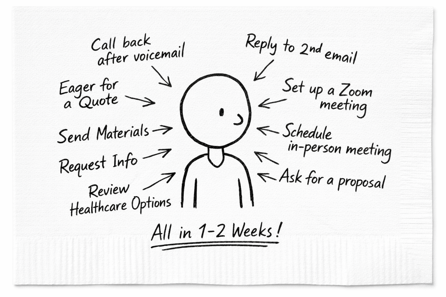 A deal for us is a managed progression. We do not “check in.” We run a Deal Flow. For each priority account, we map the structure of the deal – who decides, who influences, company profile, industry context, competitors, the incumbent and last known deal dynamics, the “internal deal advocate” profile, a healthcare plan review and additional intelligence required to run a precise approach.